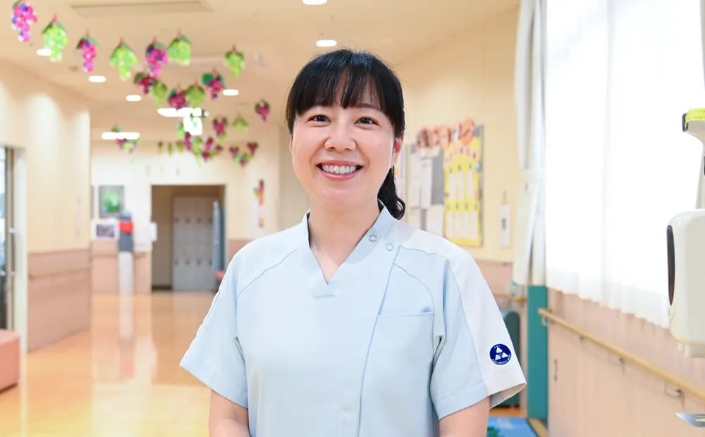 まずは、看護部長の山下さんと介護科長さんにお会いしました。職場のアピールポイントを教えてください。「年間公休120日以上・有休消化率約80%・月平均残業時間3時間など、ワークライフバランスを大切にできるところです。『小さな子どもがいて夜勤には入れないけど、常勤で働きたい!』という方も大歓迎で、家庭との両立を応援することも私たち管理職の大切な役割だと思っています」と、お2人。